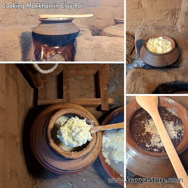 - The Butter (Makkhan) obtained by churning Bilona is separated from the buttermilk and it is put in an earthen pot (Mitti ki Handi) and heated at a low flame on a traditional chulha.